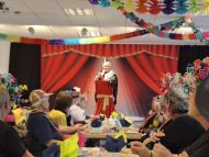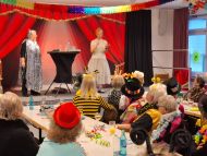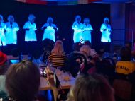Marita berichtete in der Bütt dann über den Gewinn eines Reisegutscheins. Doch leider wollte der Gatte lieber im Schrebergarten sitzen bleiben. In einem weiteren Sketch unterhielten sich Adele und Adelchen übers Alt werden. Anschließend heizte Pfarrer Hubert Werning mit einem Medley bekannter Schlager- und Ballermannhits dem Saal ein, bevor man den „Geschwistern Fürchterlich“ beim Saufgelage zuschauen konnte. Vor der Pause gab es zum Joe Cocker Hit „You can leave your hat on“ im Schwarzlicht noch eine besondere Tanzvorführung.